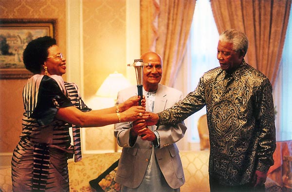 Mama Graça Machel, Sri Chinmoy and President Nelson Mandela with the Peace Torch, 1998.
